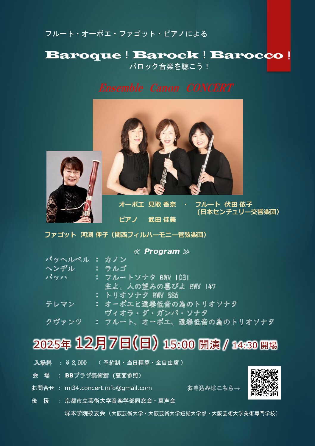 さて、引き続き今度は室内楽の演奏会のご案内です。 12/7(日)15時~、BBプラザ美術館(阪神岩屋駅すぐ、JR灘駅徒歩3分、阪急王子公園駅徒歩10分)にてバロック音楽のコンサートをいたします。 ピアノでもよく弾く曲や、皆さんがよく耳にするような曲も演奏しますし、今回は低音楽器のファゴットも入っていただきとても聴きやすいプログラムとなっております。 1年頑張ったご褒美に、ゆっくりバロック音楽を楽しんで癒されてみませんか? 予約制で人数に制限がございますので、ご希望の方はお早めに申し込んでいただけたらと思います。 皆さまのご予約を心よりお待ち申し上げます 見取香奈(門戸、苦楽園、夙川講師)